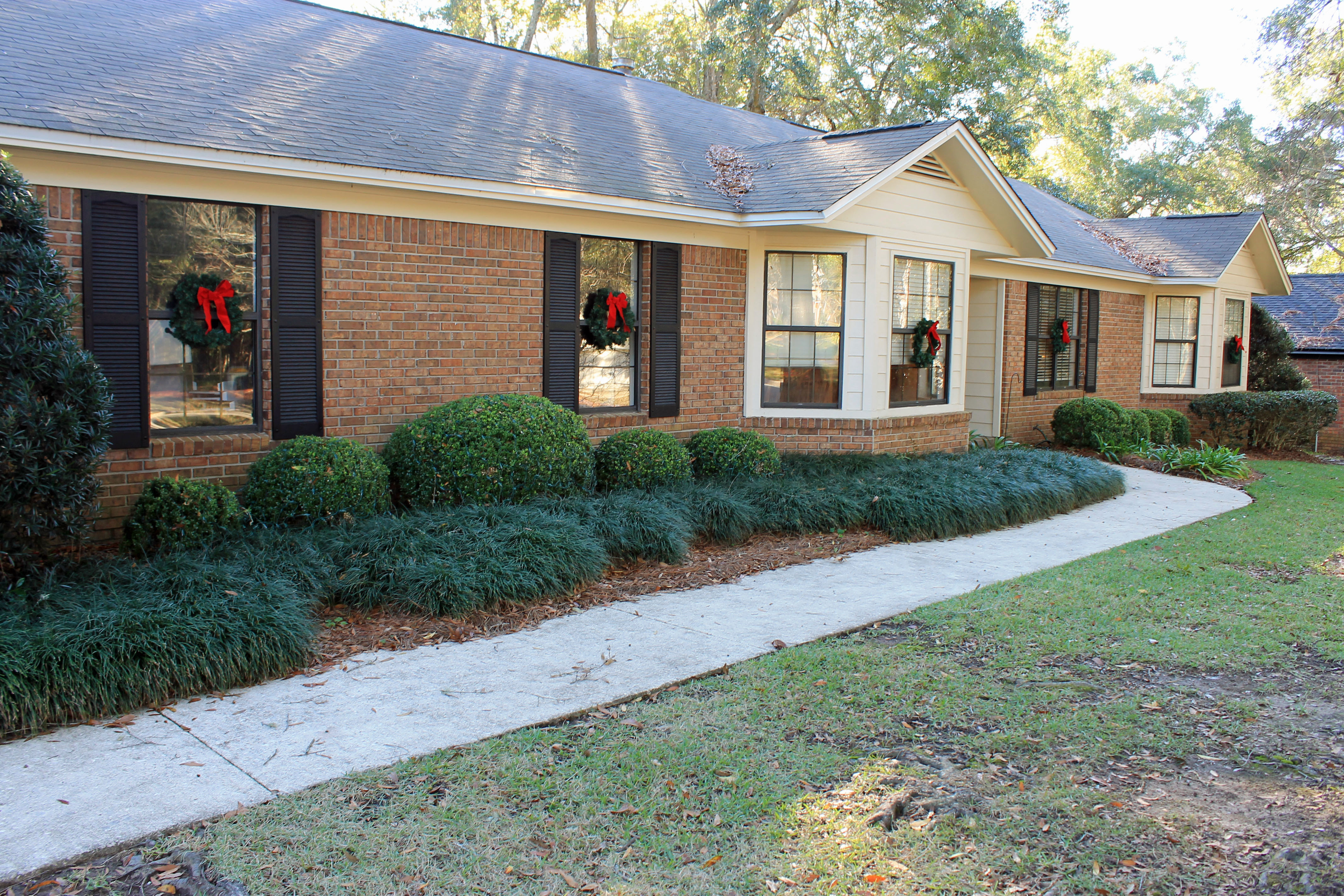dogs with wreathWe also added some net lights to the bushes in the front of the house. At least the bushes on one side of the house…haha. Our house is odd and has no outlets outside in the front or sides, so we’re limited when it comes to putting up Christmas lights. So we decided since it was so late this year to just throw on some net lights and call it a day. Next year we plan to have an electrician come out and install some outlets so we can light the bushes on the other side of the house, and maybe add some icicles to the roofline.