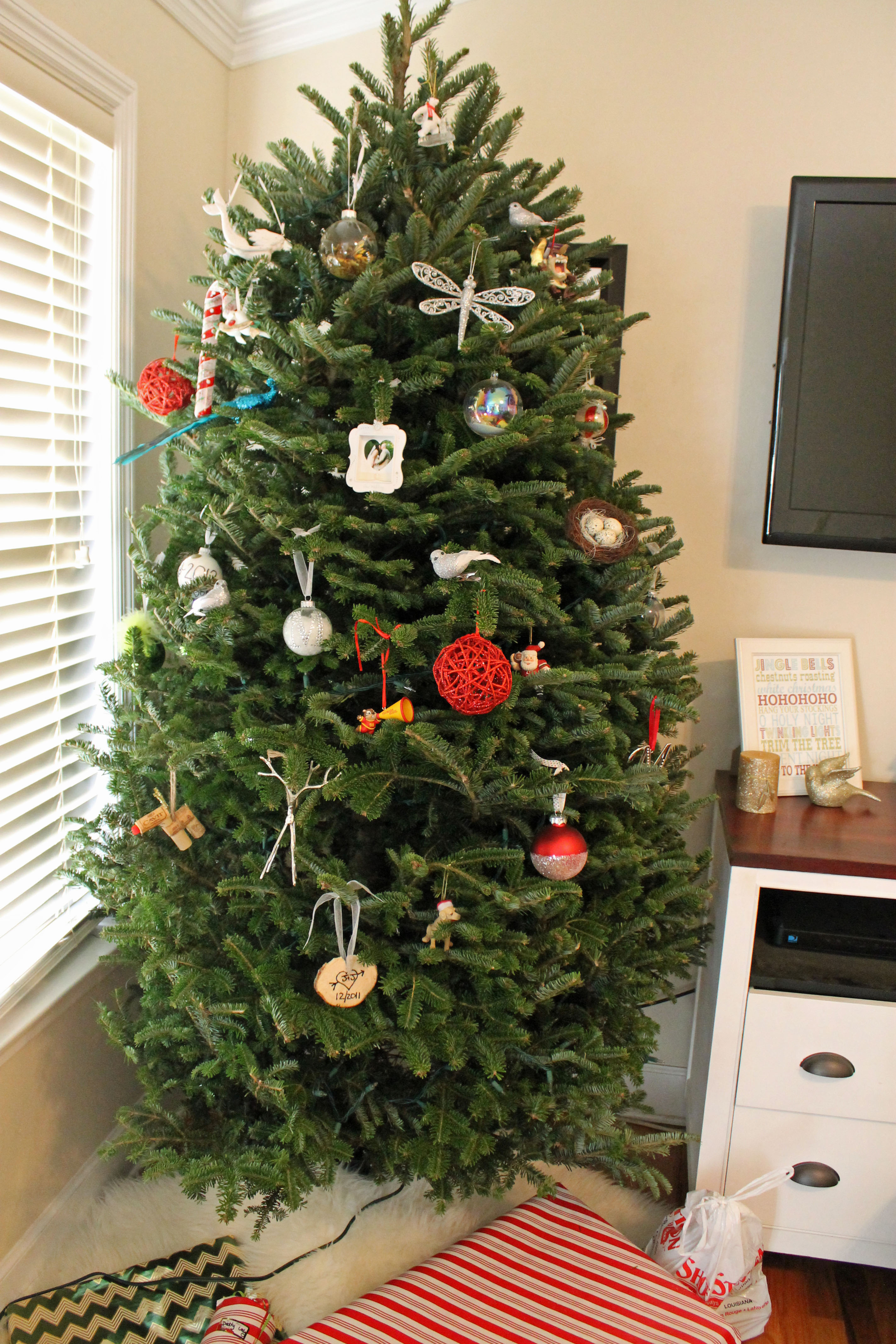 We got the flu in the second week of December though, so we lost steam about half way through. Luckily we got the outdoor lights and the tree lit and indoors before the flu officially hit, but our tree didn’t get decorated until just last weekend. And we didn’t even bother with putting on all of the ornaments…just the ones that we truly loved and have sentimental value with. Partially because we just weren’t feeling up to it, and partially because I didn’t want to put any ornaments too low for fear the dogs would get them.