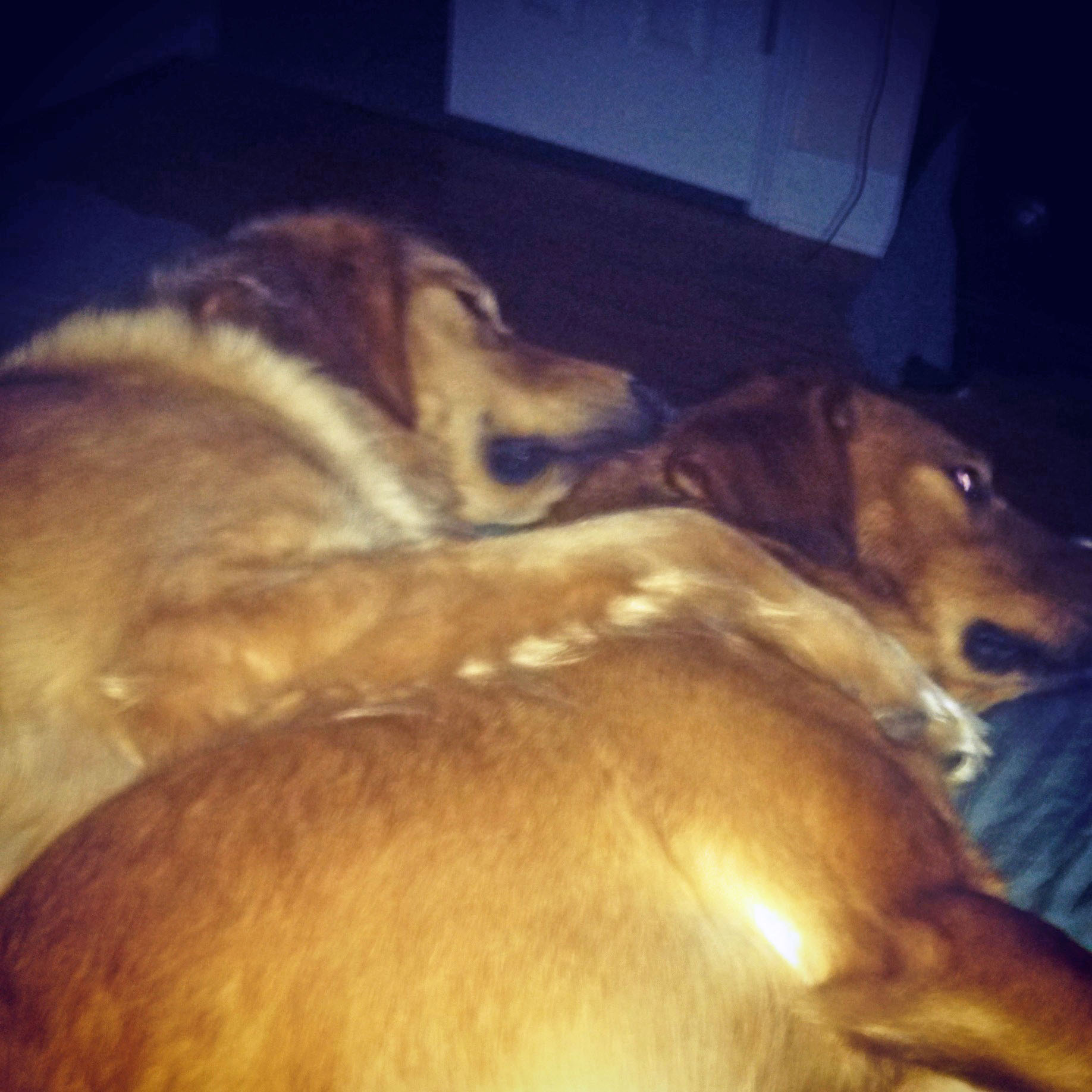 The dogs are settling down a bit, but still rowdy. They’re happy that it’s warming up and they’ve been playing (aka digging) in the backyard a lot lately. They’re also getting really good at snuggling. Sometimes even each other like the photo below: